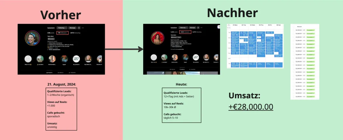 Wir kümmern uns um Reichweite, Sichtbarkeit & Leads – du nimmst den vorgeskripteten Content auf, postest Stories & schreibst mit den Interessenten.
